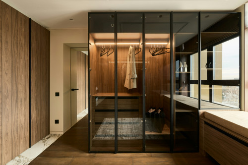 Garderoben är lämplig för större utrymmen där en kombination av funktionalitet och en ren, modern stil krävs.